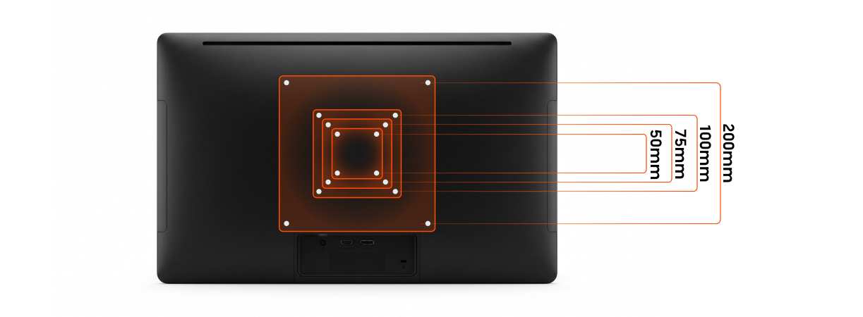 Depending on the monitor size, the VESA pattern may vary. Larger screens may use 200 x 200 mm, while some compact or older models may use 50 x 50 mm. In some cases, an adapter plate is required.