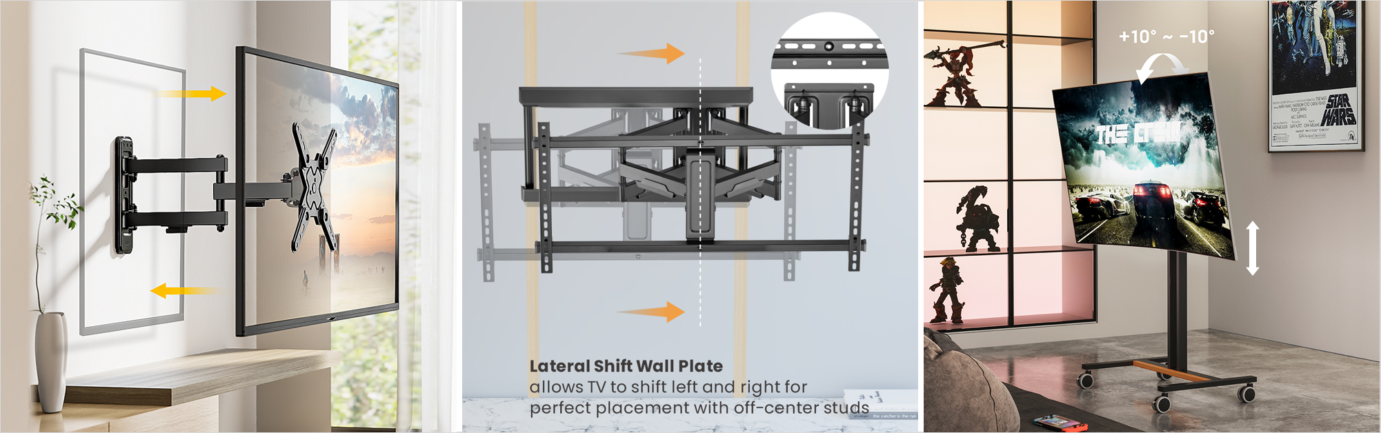• Full Motion / Articulating TV Mounts Offer the most flexibility, allowing the TV to extend, swivel, and tilt. Perfect for living rooms or bedrooms with multiple seating areas.